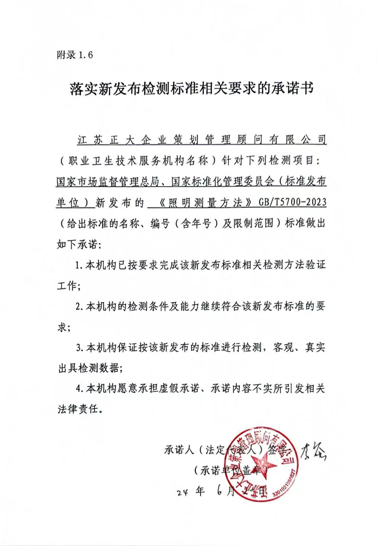 落實新發(fā)布檢測標(biāo)準相關(guān)要求的承諾書